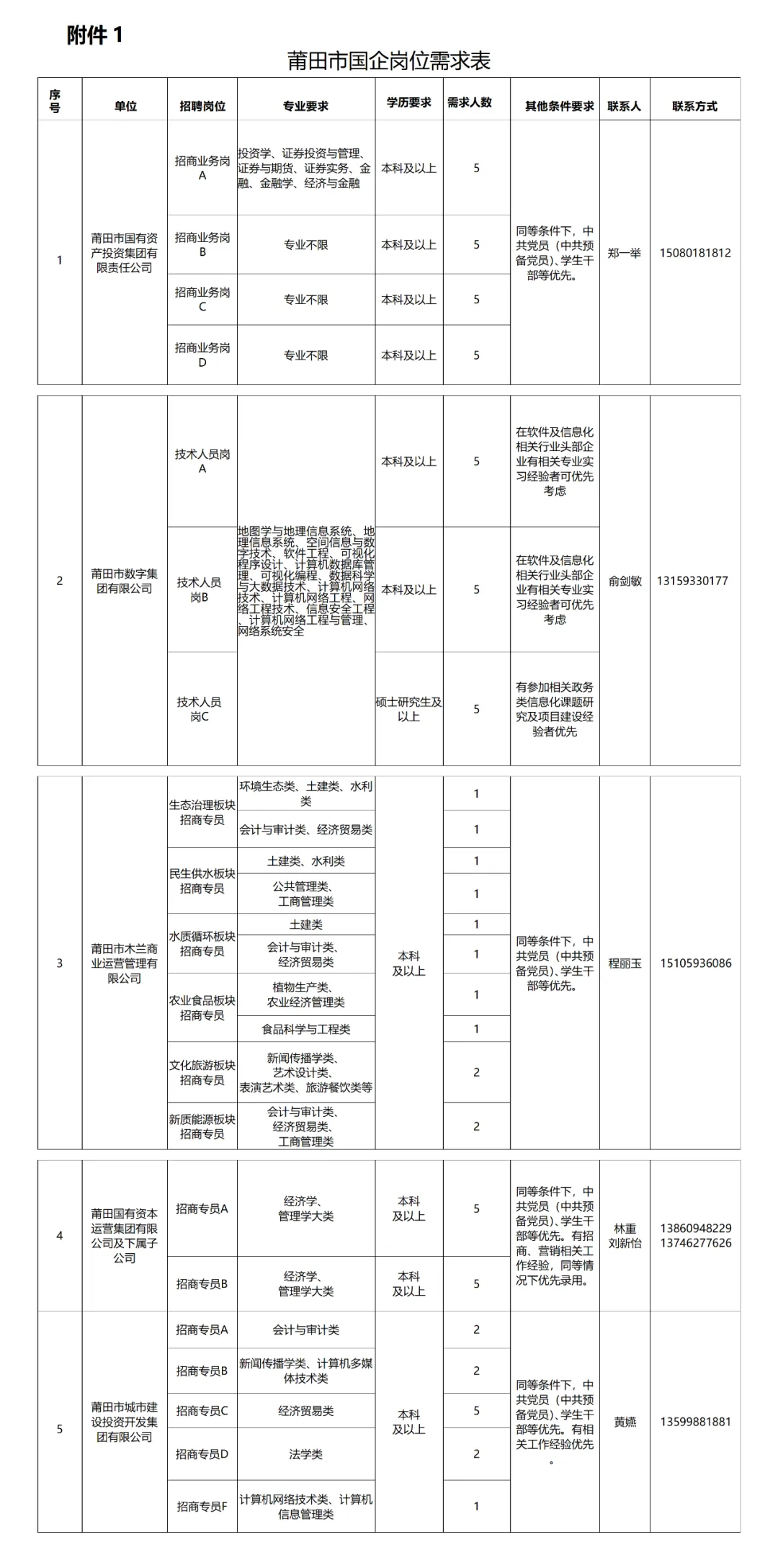 为贯彻落实市委、市政府提出的“俯下身子抓产业、一心一意谋发展”和“项目强、产业强、莆田强”的工作要求,加强国有企业招商队伍和信息技术队伍建设,拟向高校公开考核招聘国有企业人才69名。经研究,具体方案如下: