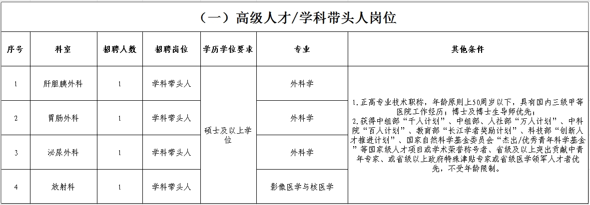 根据医院建设规模和业务发展需要,为加快医院学科建设,培养一支高素质专业团队,现面向全国招贤纳才,常年公开招聘部分学科带头人及学科骨干,诚邀各专业贤能之士加入我院,施展才干、成就梦想,携手开创医院高质量发展的美好未来。