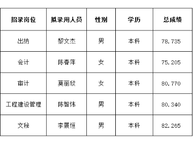 根据《东莞市桥头实业投资控股集团有限公司招聘公告》有关安排,经资格审查、笔试、面试、体检等招聘程序,现将拟录用人员名单公示如下:
