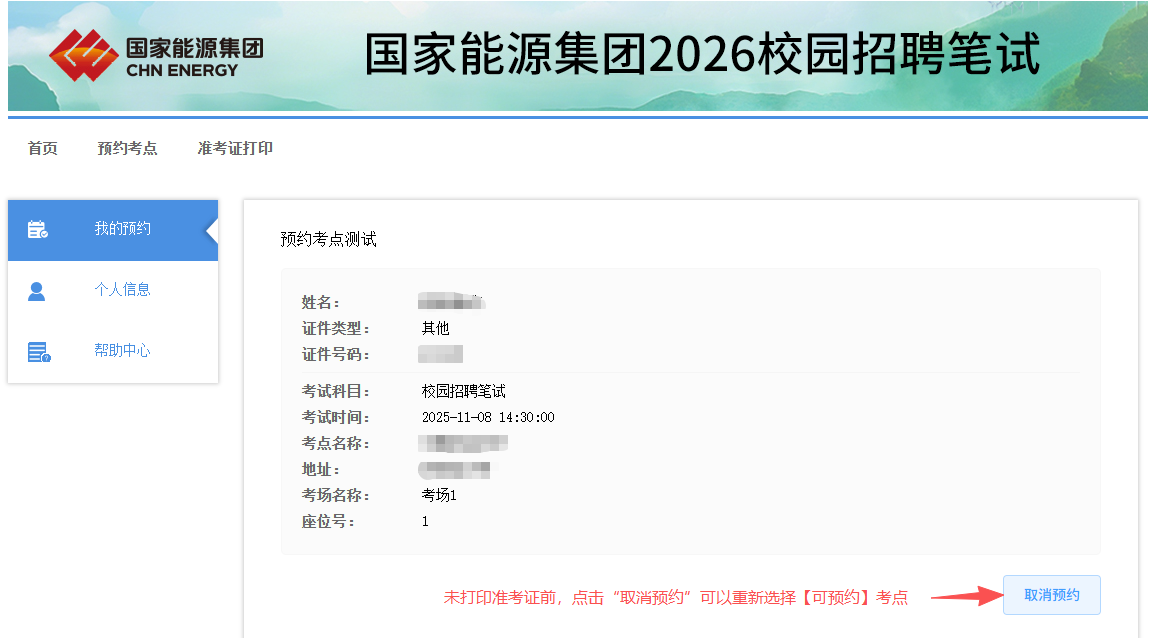 5、查看预约,未打印准考证的可取消预约并重新选择【可预约】的考点