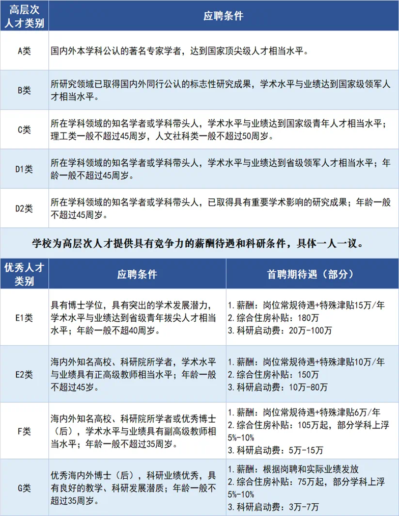 说明:1.重点学科领域的紧缺人才,学校给予政策倾斜,待遇一人一议;2.综合住房补贴按学校政策发放,E-G类人才入职后可申领2/3;3.学校协助解决引进人才落户、子女入学等事宜;4.其他未尽事宜按照《中国计量大学人才引进实施办法》及相关文件执行。