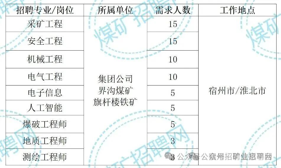 2、历届毕业生:煤矿要求有丰富的工作经验。铁矿要求有大中型金属矿山工作经验,从事过水文地质复杂矿井经历者优先录用;