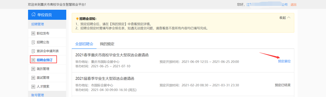 (一)学校发布双选会邀请函,开放网上预订后,用人单位登陆就业信息网(https://cqust.cqbys.com/)在“招聘会预定”页面,查看近期举办的招聘会。
