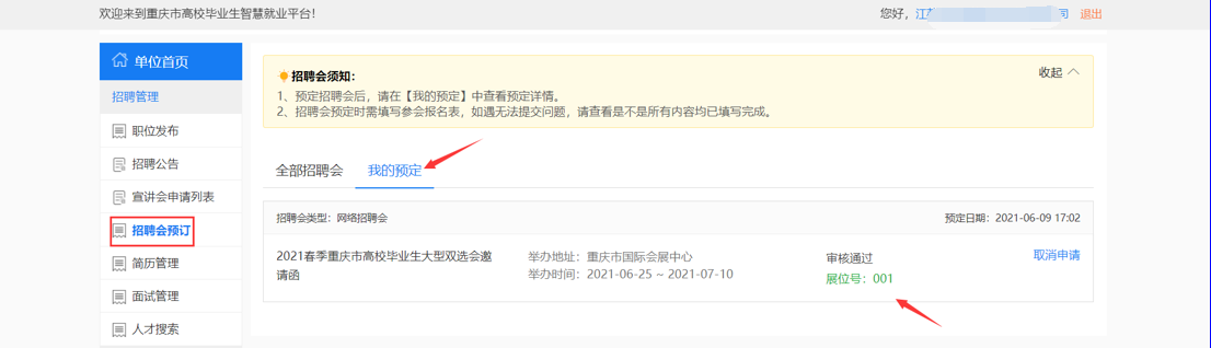 (四)学校审核通过后,系统会给单位发送展位审核通过邮件,单位登录系统,点击【我的预定】,查看招聘会展位等信息,如图: